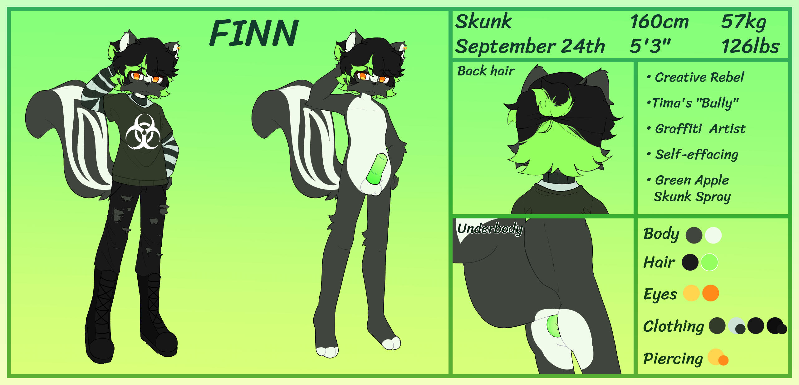 Finn is an anthropomorphic teenage Skunk, often showcased in NSFW commissions with Tima.Finn lives in the same apartment complex as Tima and usually picks on Tima. The bullying exists out of mostly name calling & groping, which Tima usually just laughs about because they think they're just being friendly to them. Which flusters Finn and makes him want to bully Tima even more.Finn loves to draw digitally or with graffiti, and tries to gain a following with it online. He currently has a small following of a couple hundred on his socials with his art, and gets commissioned regularly enough to pay his rent.Finn often distances himself from the others of the apartment, often locking himself up in his apartment or hanging around on the side of the building. Only showing his face often during parties.