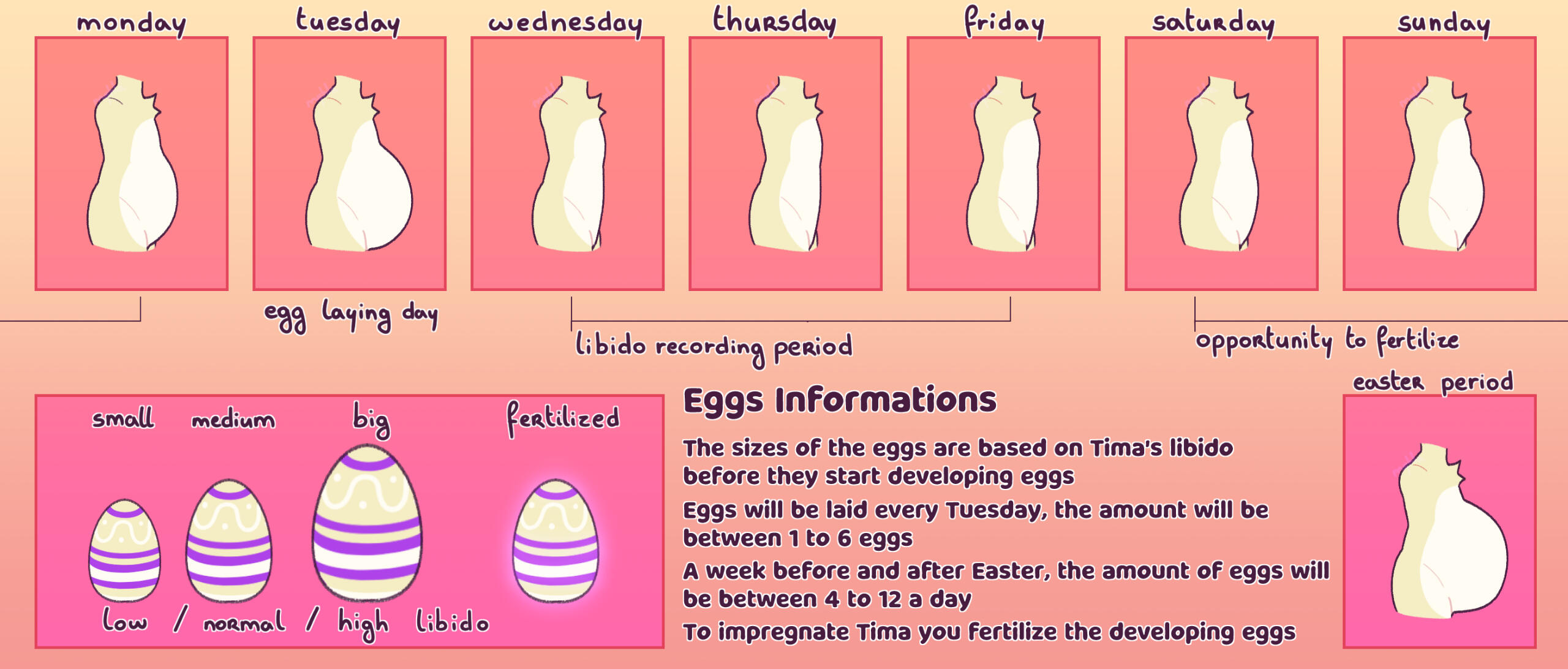 Tima lays eggs every Tuesday, which is between 1 to 6 eggs. Tima's stomach will start to grow and make eggs every Saturday and keeps growing bigger over the span of 3 days before they have to lay the eggs. During the time their stomach grows, their eggs will be able to get fertilised during that period.The sizes of the eggs are based on Tima's libido before they start developing eggs.